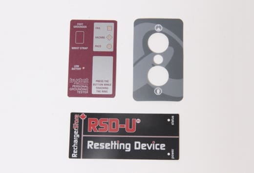 A polycarbonate label where the thickness ranges from .005โ€™โ€™ to 0.020โ€™โ€™ (0.127mm to 0.5mm). Polycarbonate is printed sub-surface (or from behind) and then laminated to a self-adhesive transfer tape such as 3M 467 and 3M 468 which use the 200MP adhesive or 3M 9472LE which uses 3M 300LSE adhesive. The printed graphic is encapsulated between the polycarbonate layer and the adhesive thereby protecting it from the elements, cleaners and abrasives. Lexan is extremely durable in harsh environments and has exceptional temperature characteristics performing well in conditions ranging from -40ยฐF to 275ยฐF (-40ยฐC to 135ยฐC). Using our recommended adhesives the polycarbonate labels can be applied to many different surfaces: metal, painted metal, powder coated metals, plastics. Lexan labels can be fabricated with holes and irregular shapes for use as graphic membranes for control panels.